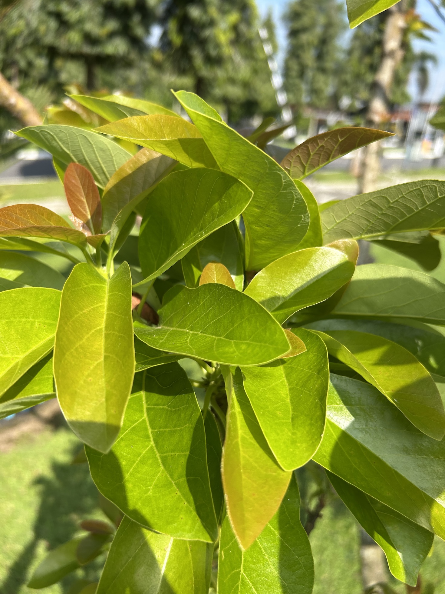 - Daun: Tunggal, berbentuk elips hingga lonjong, berwarna hijau gelap mengkilap di bagian atas dan lebih pucat di bagian bawah. Daun muda seringkali berwarna kemerahan.