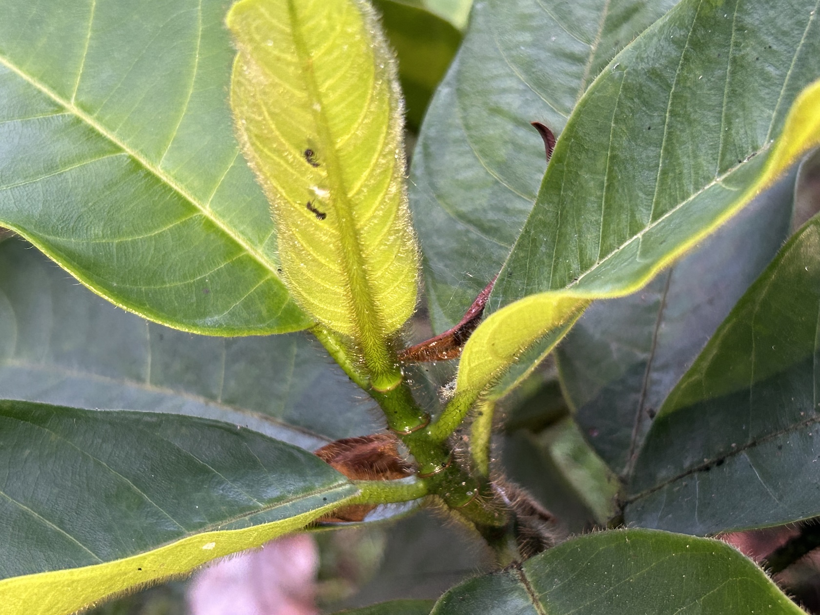 - Daun: Daun tunggal, berbentuk elips hingga lonjong, berukuran sedang, berwarna hijau tua mengkilap di bagian atas, dan sedikit berbulu di bagian bawah.