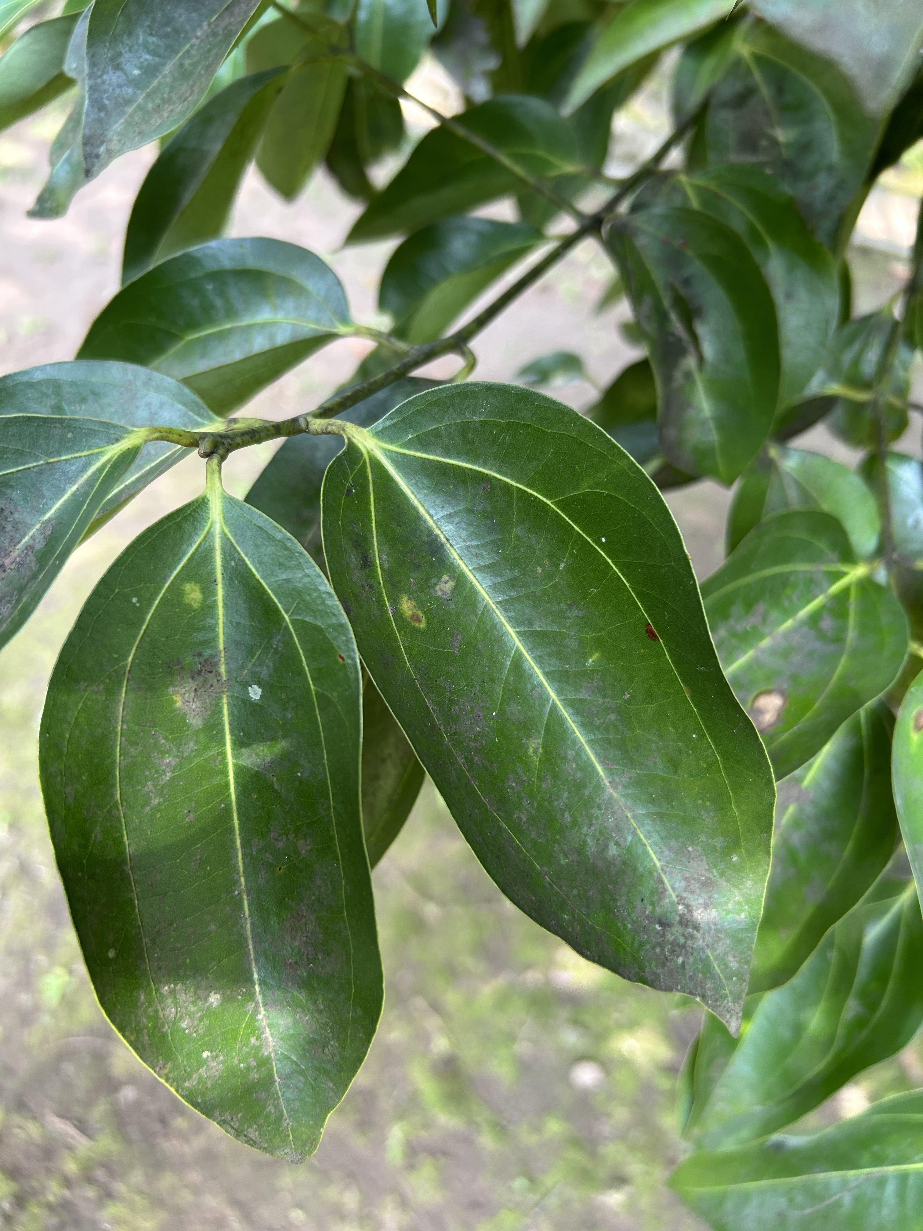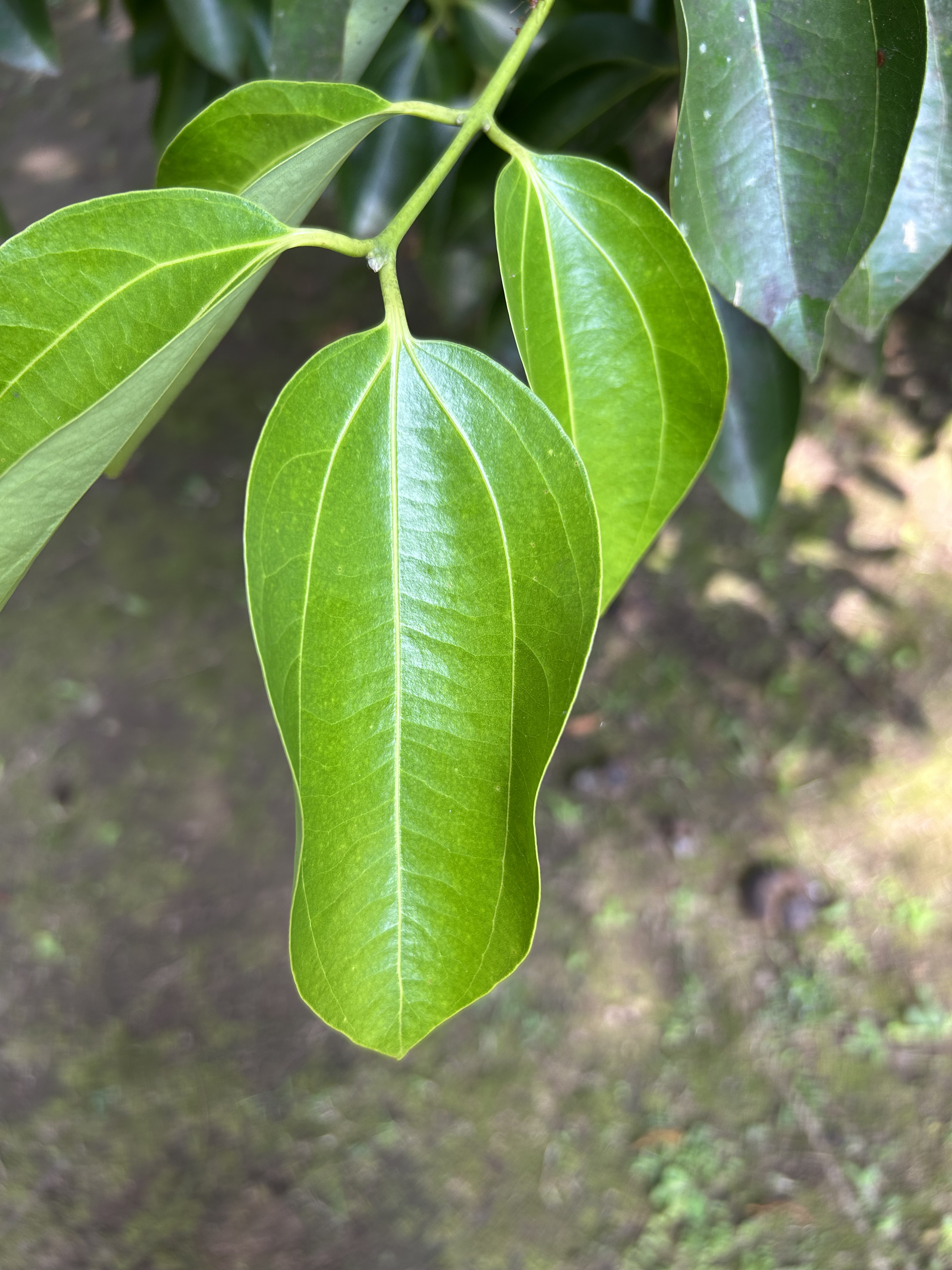 - Daun: Tunggal, berbentuk lonjong hingga elips, dengan ujung meruncing. Berwarna hijau gelap mengkilap di bagian atas, dan lebih pucat di bagian bawah. Memiliki 3-5 urat daun utama yang menonjol dan sejajar (ciri khas genus Cinnamomum). Jika diremas, daun mengeluarkan aroma rempah yang khas.