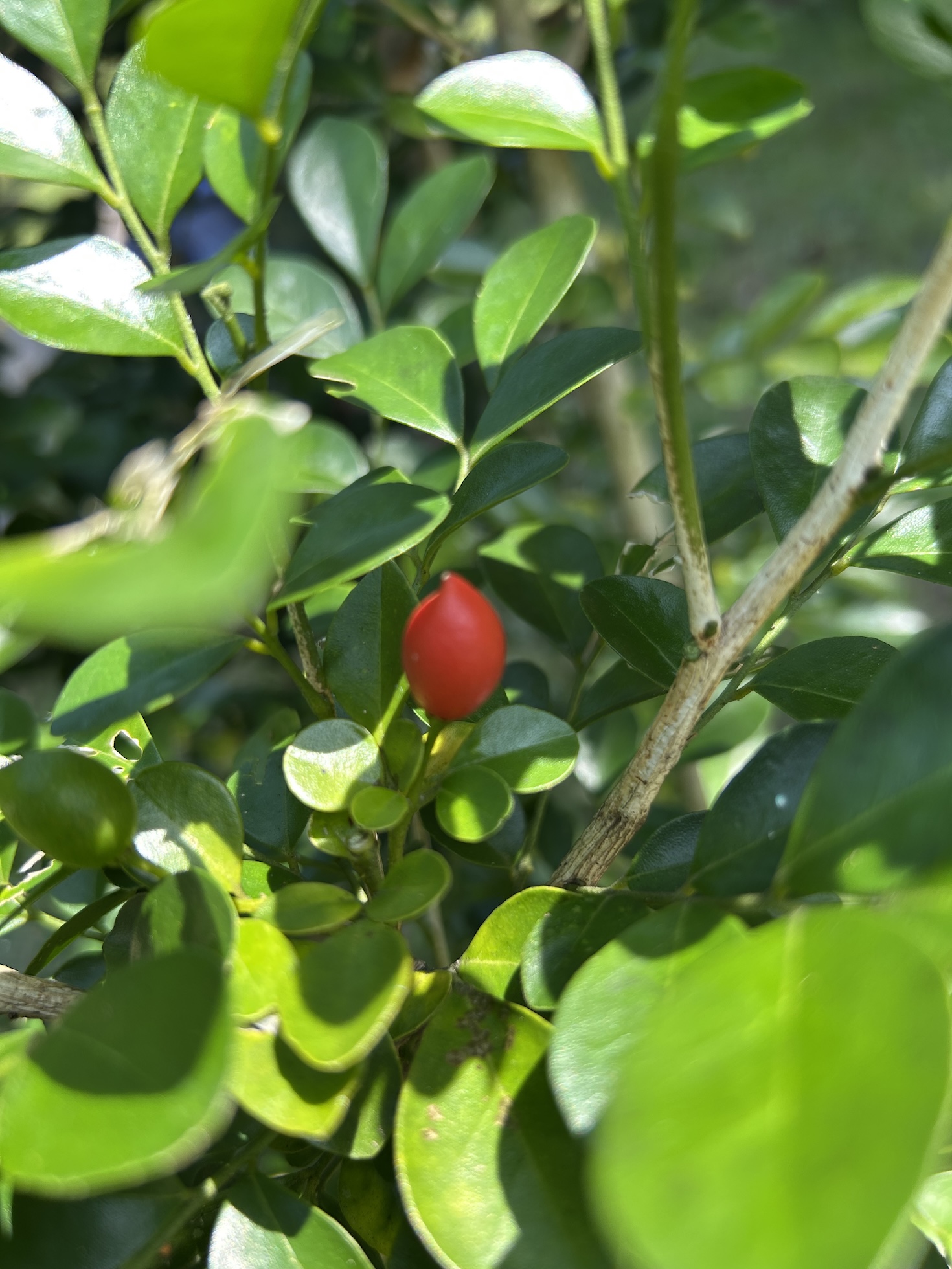• Buah: Buahnya kecil, berbentuk bulat telur, berwarna hijau saat muda dan berubah menjadi oranye kemerahan saat matang. Buahnya sering menjadi daya tarik bagi burung.