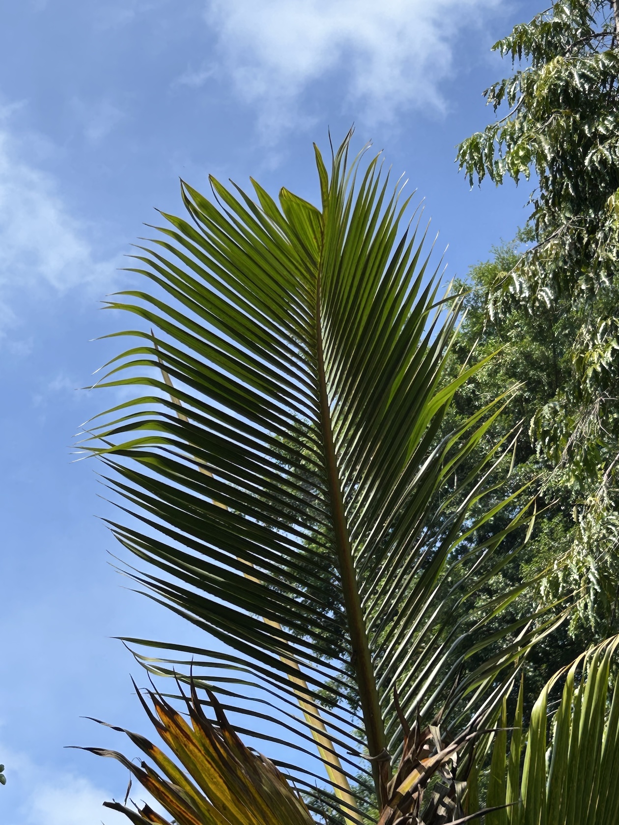 • Daun: Majemuk menyirip, melengkung anggun, berwarna hijau gelap, dan panjangnya bisa mencapai 2-3 meter. Daun-daun ini tumbuh membentuk mahkota di puncak batang yang ramping.